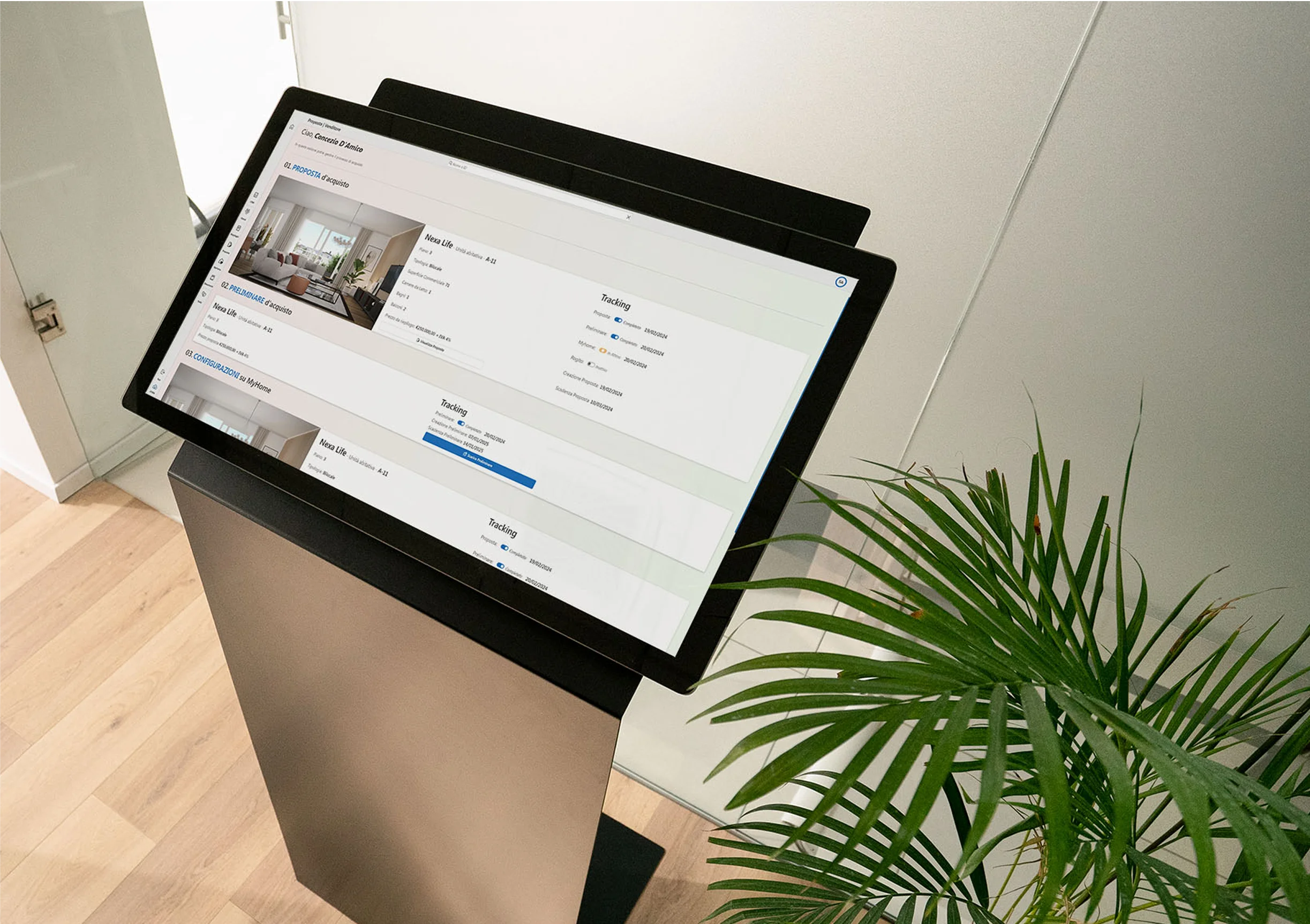 Soluzioni hardware dedicate alla digitalizzazione del punto vendita, con l’obiettivo di rendere l’esperienza del cliente immersiva e memorabile. Il Totem Multi-Touch, abbinabile a visori VR per la prima presentazione degli immobili, e la Immersive Room, progettata per far vivere l’edificio come se fosse già realizzato, trasformano lo showroom in un ambiente innovativo e coinvolgente.
